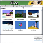 현재 Alice 2.2 베타 버전에서 만들 수 있는 동영상 파일의 형식은 MOV이다. Alice 2.2의 정식 버전은 AVI 형식도 가능하도록 개발 중이다. 자! 이제 자신이 만든 Alice 월드를 동영상으로 만드는 방법에 대해 알아보자. 1. Alice에서 제공하는 예제 월드인 lakeSkater 월드를 동영상으로 만들어 보자. File > Open World를 클릭하면, 다음 그림과 같은 Welcome to Alice! 대화상자가 표시된다. Examples 탭을 선택한다. 그리고 lakeSkater 월드의 썸네일 이미지를 찾아 클릭한 다음, Open 버튼을 누른다. 2. 다음 그림은 lakeSkater 월드를 불러온 화면이다. 3. 여기서, File의 Export Video...를 클릭한다. 그러면 ..