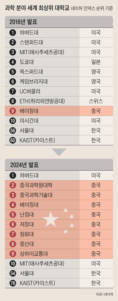 네이처가 과학 분야 대학 순위를 처음으로 발표한 ‘2016 네이처 인덱스(2015년 연구 성과 평가)’에서 당시만 해도 상위 10위 안에 든 중국 대학은 베이징대(9위) 한 곳뿐이었다. 1~3위를 휩쓴 미국이 5곳, 유럽은 3곳을 톱 10 대학에 올렸다. 이러한 판도를 중국이 8년 사이에 뒤엎었다. ‘2024 네이처 인덱스’에서 중국과학원대학(2위)을 비롯해 무려 8개 중국 대학이 톱 10을 휩쓸었다. 10위 안에 든 미국 대학은 2곳(하버드·MIT)만 남았다.