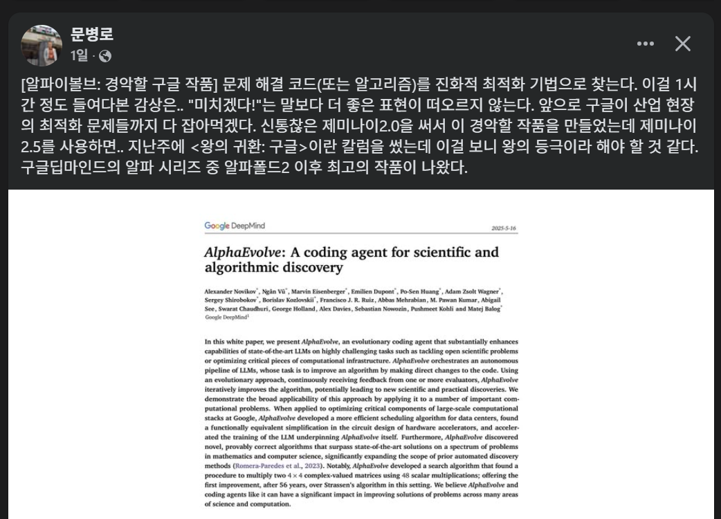 구글이 알파고, 알파폴드에 이어 '코딩 에이전트' AlpahEvolve를 내놓은 모양이다. 서울대 컴퓨터공학부 문병로 교수가 "미치겠다"라는 한 마디로 이 기술에 대한 감상을 요약한다.