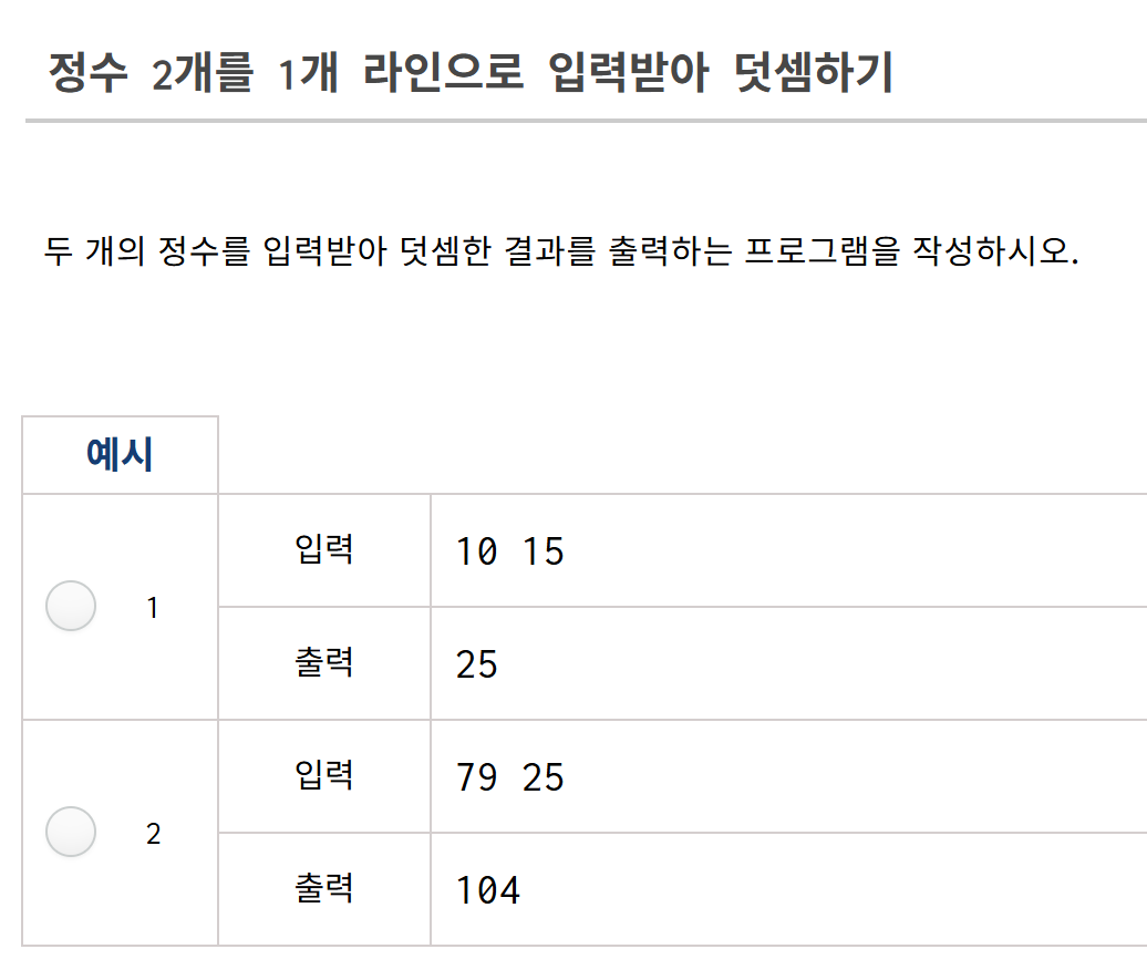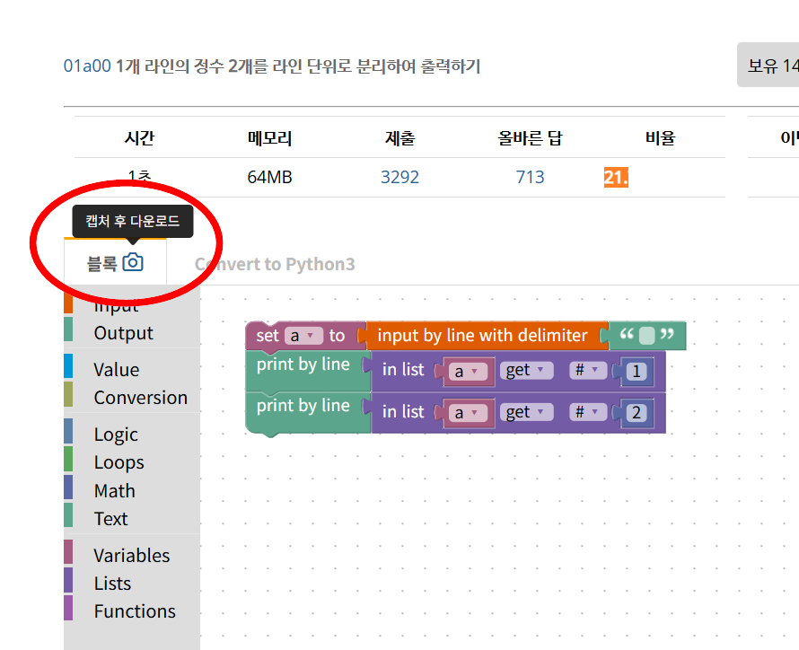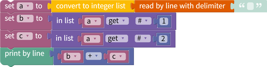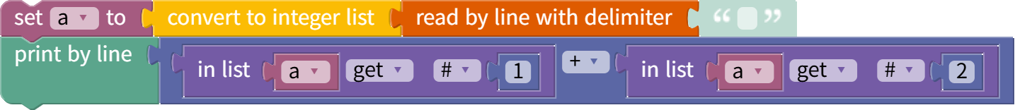예를 들어, <그림6>과 같이 한 줄에 정수 2개를 입력받아 덧셈한 결과를 출력하는 문제의 경우, <그림5>와 같은 블록이 없다면 <그림7>, 또는 <그림8>과 같은 복잡한 과정을 거쳐야 한다. 즉, 1개 라인에 2개 이상의 값이 공백을 사이에 두고 주어질 경우, 공백을 구분자로 값을 분리하여 그것을 리스트에 저장하고, 각 리스트 원소를 참조하여 값을 계산하는 과정을 거쳐야 한다. Blockly에서는 기본적으로 text 형식으로 입력되므로, '처리'를 위해 적절하게 형변환해야 하는 게 필수다.