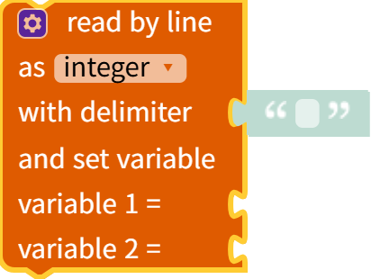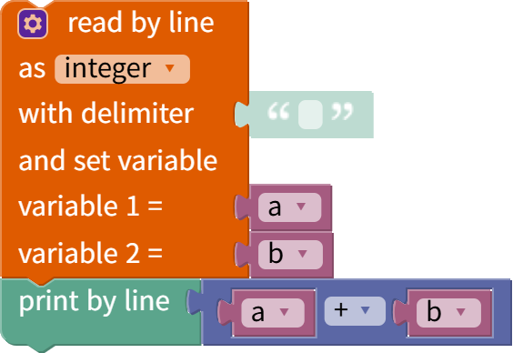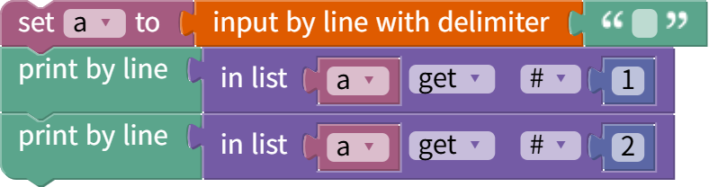 블록 코딩이더라도 기본적인 입출력은 쉽지 않다. '입력', '처리', '출력'이라고 하는 알고리즘의 기본적인 3단계에서 '입력'을 제대로 받지 못하면 그 다음의 처리와 출력은 불가능하다. 특히, 입력값이 공백으로 구분된 2개 이상의 값이라면 더더욱 그렇다. 하나의 구분자로 구성된 2개 이상의 값을 입력받는 블록을 <그림5>와 같이 개발했다. 타입은 integer, float, text 타입 중 하나를 선택할 수 있다. 이제는 어떤 형식이든 한 라인으로 입력되는 여러 개의 값을 쉽게 입력 처리할 수 있다. 즉, 구분자로 분리되는 2개의 값을 특정 형식으로 변환하여 지정한 변수들에 저장하는 역할을 수행한다. 단, 입력되는 값이 2개 이상이어야 한다.