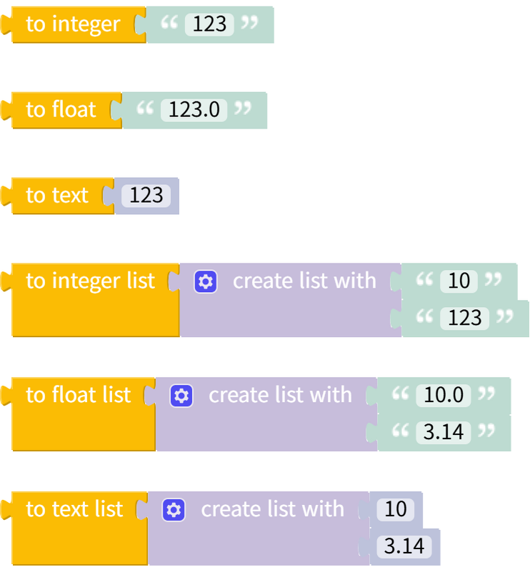 형 변환은 프로그래밍 언어에서 매우 중요한 요소이지만, 코딩을 처음 배우는 사람에게는 매우 어려운 개념이다. 더군다가, 리스트 변환은 더욱 그렇다. 왜 이런 과정이 필요한지에 대한 개념도 처음에는 쉽지 않다. 예를 들어 숫자를 그냥 눈으로 보기에는 integer든, float든, 텍스트이든지 구분되지 않는다. 그냥 숫자들의 나열일 뿐... 그러나 이것을 입력받아 컴퓨터 내부에서 처리하기 위해서는 정수인지, 실수인지, 그냥 텍스트인지에 따라 처리되는 방식이 다르기 때문에 적절하게 형변환해야 한다. 즉, 텍스트 형식의 숫자들을 산술 연산하기 위해서는 그 값들을 정수나 실수로 형변환 해야 한다. 그래서 codingfun.net에서는 <그림10>과 같은 블록들을 제공했는데, <그림 11>과 같이 이를 통합하여 사용의 편리성을 더했다.