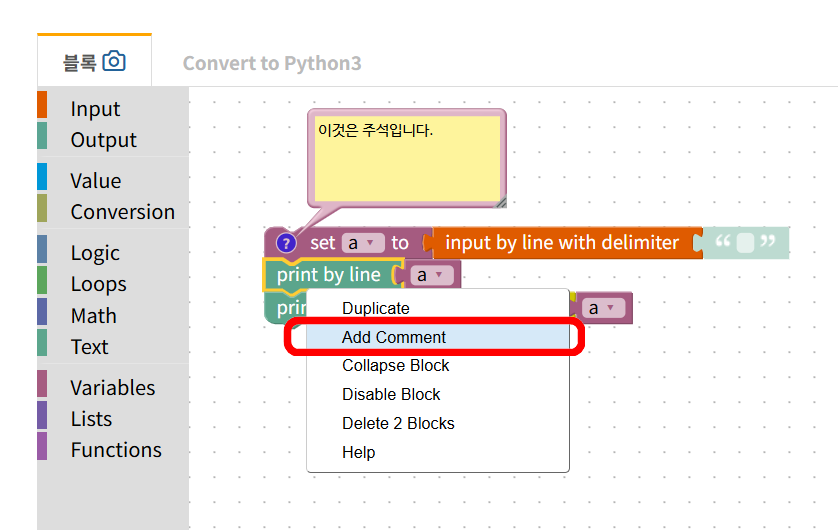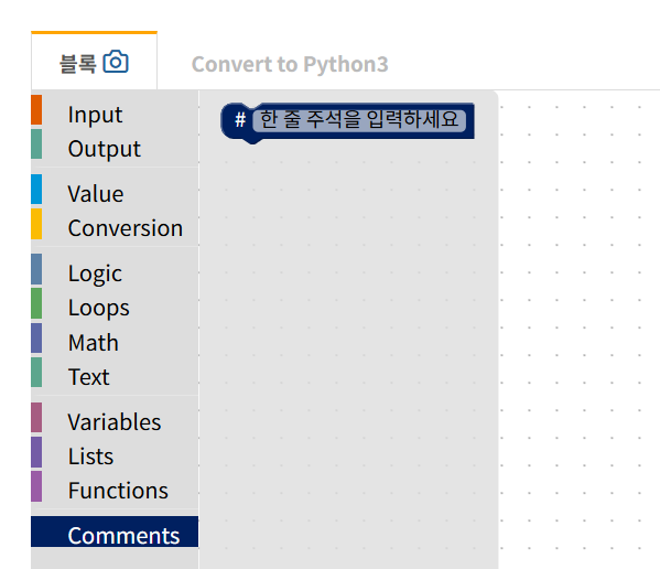 Blockly에서는 <그림3>과 같은 주석 기능을 제공한다. 그러나, 이러한 주석은 다운로드되는 이미지에 포함되지 않는다.