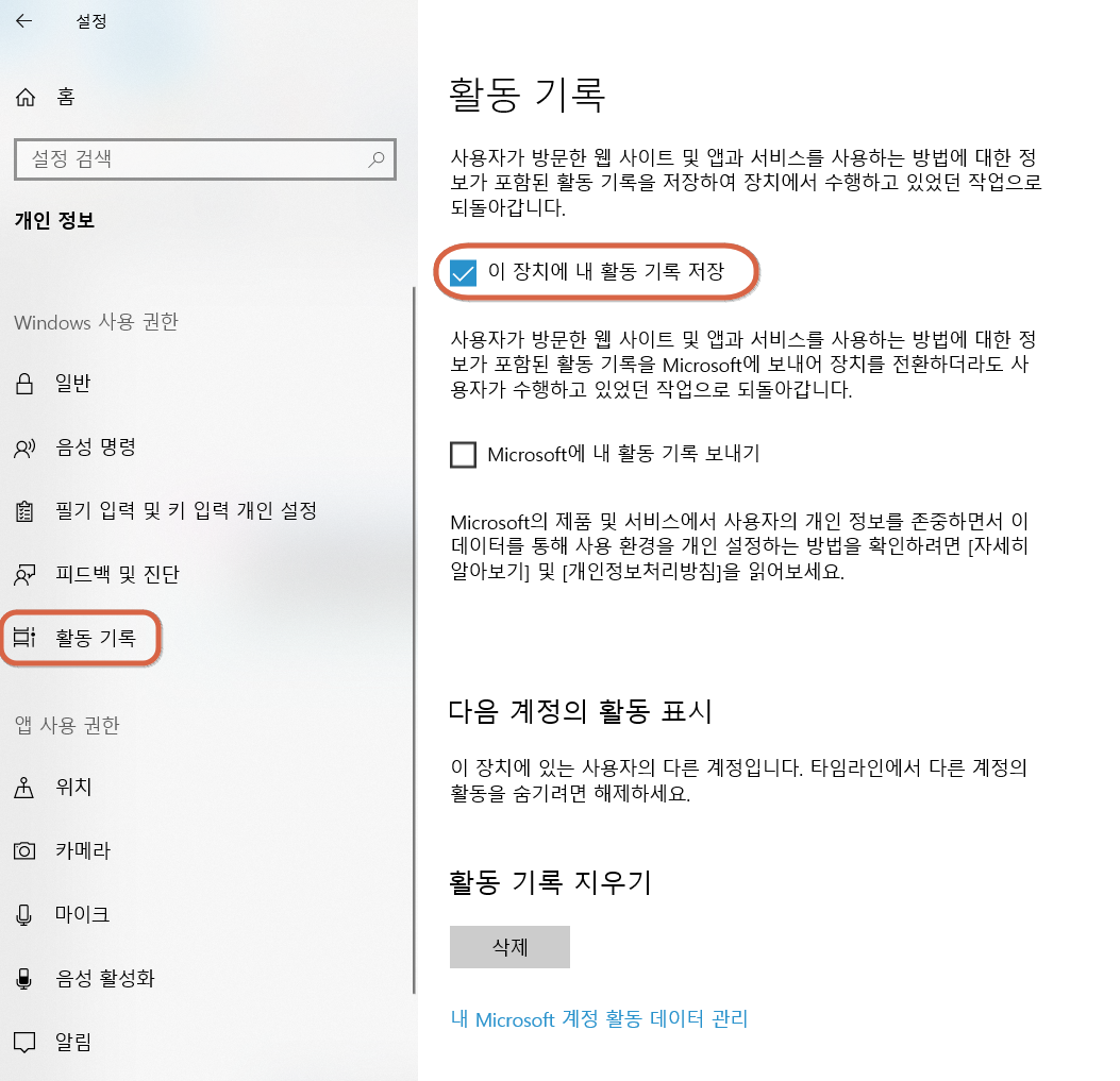 설정 > 개인 정보 및 보 > 활동 기록 > 이 장치에 내 활동 기록 저장에서 체크 (윈도우10에서는 디폴트로 체크되어 있으나, 윈도우11에서는 사용자가 직접 체크해야 한다)