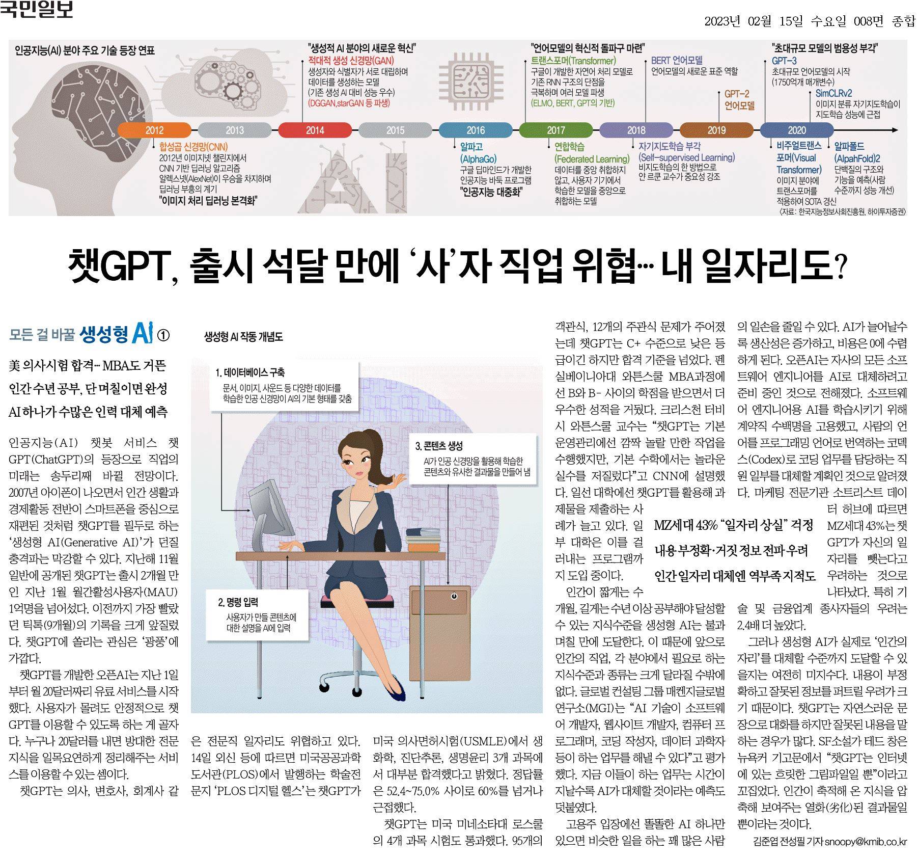 스크랩 [국민일보] 챗GPT, 출시 석달 만에 '사'자 직업 위협 ... 내 일자리도? (2023.2.15.) 코딩펀 2023. 2. 17. 01:05 교육부 신문 스크랩 저작자표시 변경금지 (새창열림)